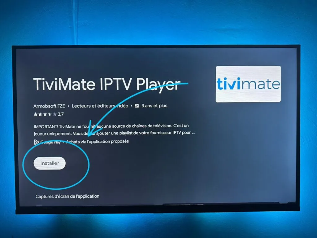 Pour installer et configurer TiviMate sur votre Android TV, commencez par vous assurer que vous êtes connecté à Internet. Accédez au Google Play Store, recherchez « TiviMate IPTV Player » et appuyez sur « Installer« .